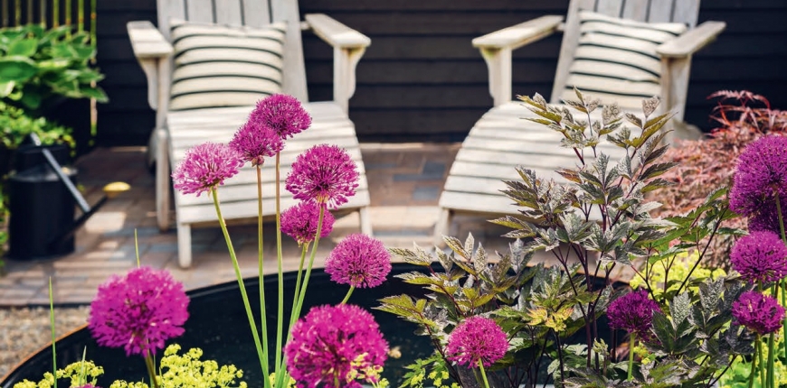 W połączeniach polecanych do nowoczesnych prezentacji ogrodowych nie może zabraknąć czosnków ozdobnych o kulistych kwiatostanach na długiej wyrazistej łodydze. Kwitną, gdy inne cebulowe zwykle już przekwitły. Na rabacie prezentują się okazale w towarzystwie roślin stożko-wiechowatych. Dlatego możemy prezentować je z innymi odmianami na topie jak np. pustynniki, szałwie, ostróżki, tawułki. Bardzo dekoracyjną i utrzymaną w tej samej tonacji kolorystycznej kompozycję stworzy czosnek w towarzystwie kocimiętki, byliny o małych wymaganiach uprawowych, a szybkim i dekoracyjnym rozroście.